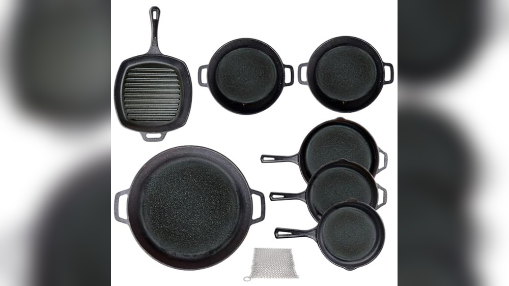 1. Bruntmor 8 Piece Cast Iron Cookware Set – Pre-Seasoned Pots and Pans Set with Cast Iron Skillets, Grill Pan, Dutch Oven, Pizza Pan, and Scrubber – Heavy Duty Cooking for Home Kitchen or Camping