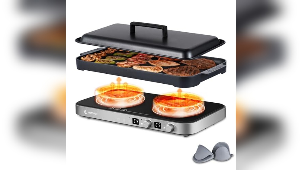 1. AMZCHEF Double Induction Cooktop with Removable Griddle Pan Non-stick, 1800W 2 burner Portable Induction Stove With Sensor Touch 9 Power Levels, 99 Min Timer, Iron Grey